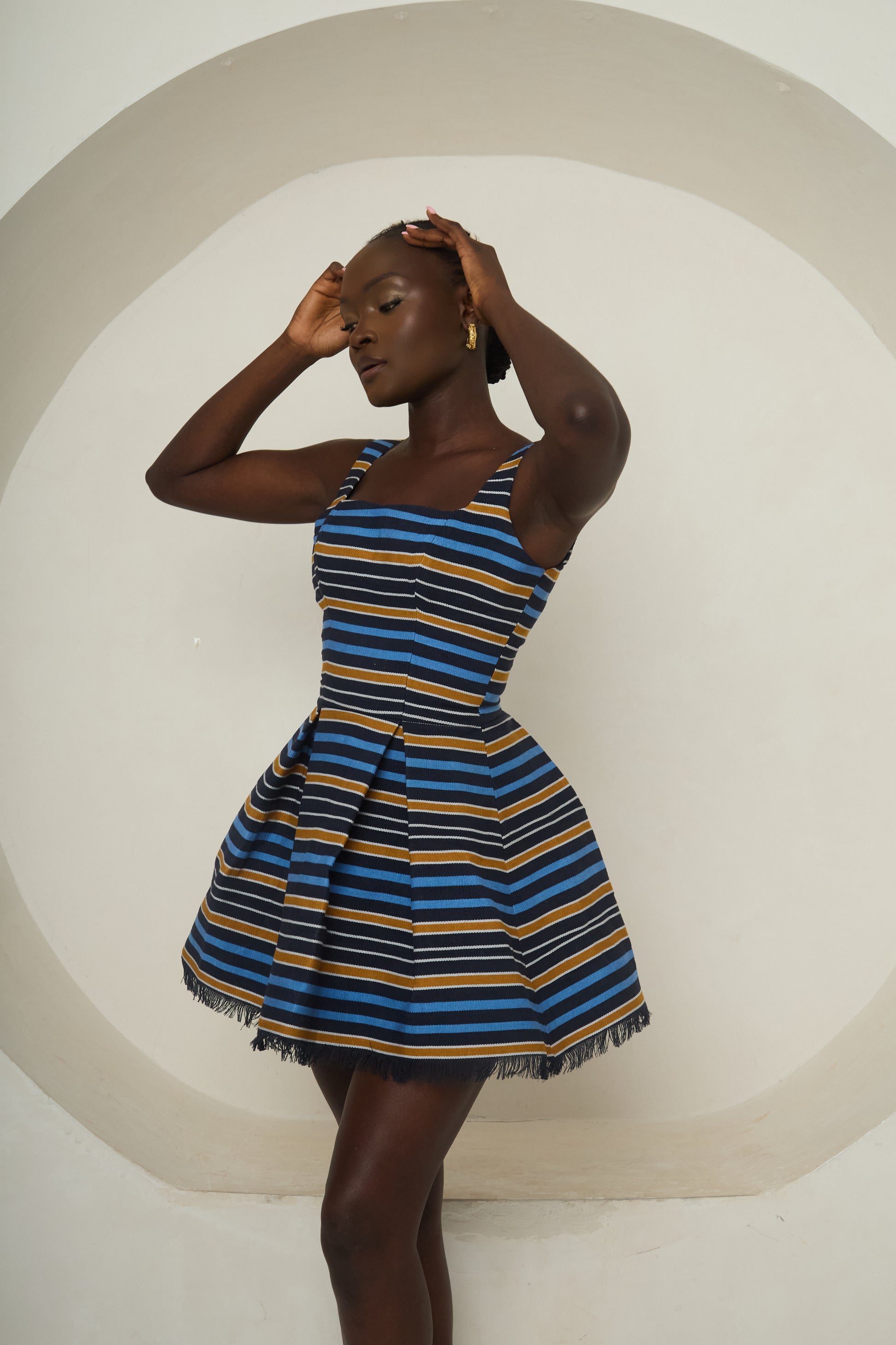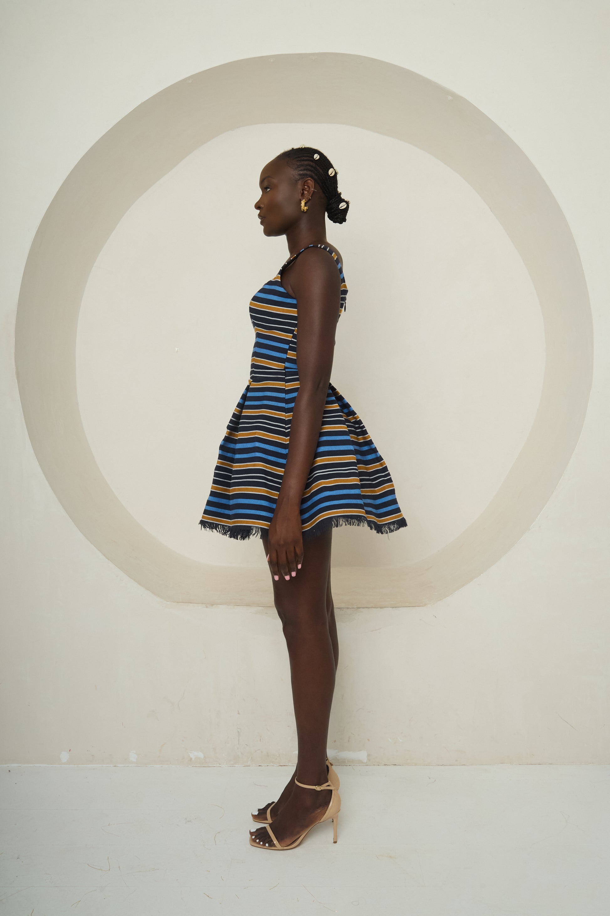 The Àdarátan mini dress fuses heritage and playfulness in a sleeveless fit-and-flare silhouette. Handwoven in bold stripes of navy, cobalt, mustard, black, and ivory, the tailored bodice flows into sculptural box pleats, finished with a raw fringe hemline that celebrates craftsmanship. Vibrant yet polished, it embodies confidence, movement, and cultural pride reimagined for today.
