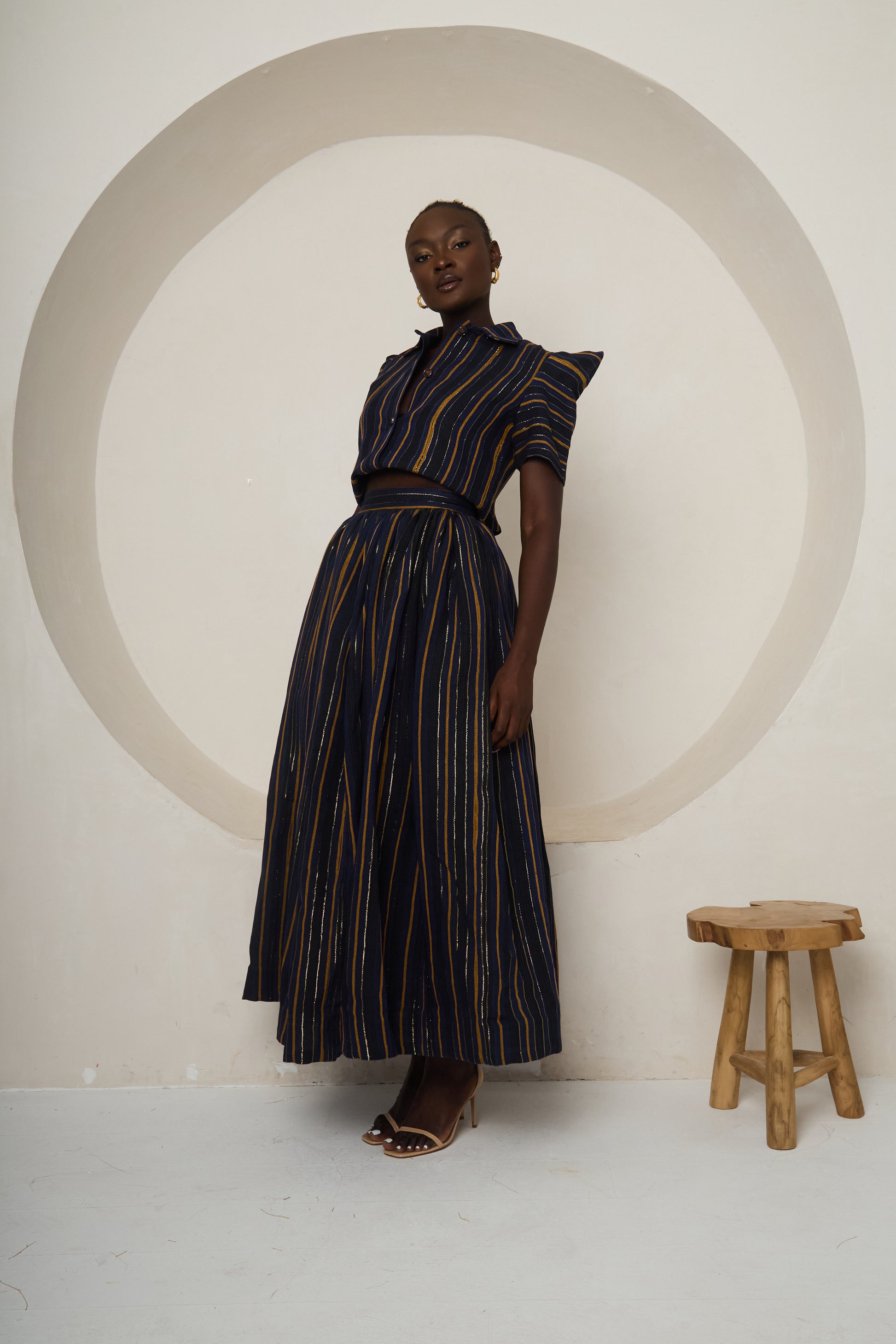 The Àdè ensemble pairs a flowing Aso-Oke midi skirt with a short, structured blazer for a balance of tradition and modern tailoring. In vibrant blue and mustard, the free A-line skirt moves with ease while the cropped blazer, finished with short sleeves, adds polish and versatility. Designed for cultural celebrations and statement-making moments, it redefines elegance with effortless flow.