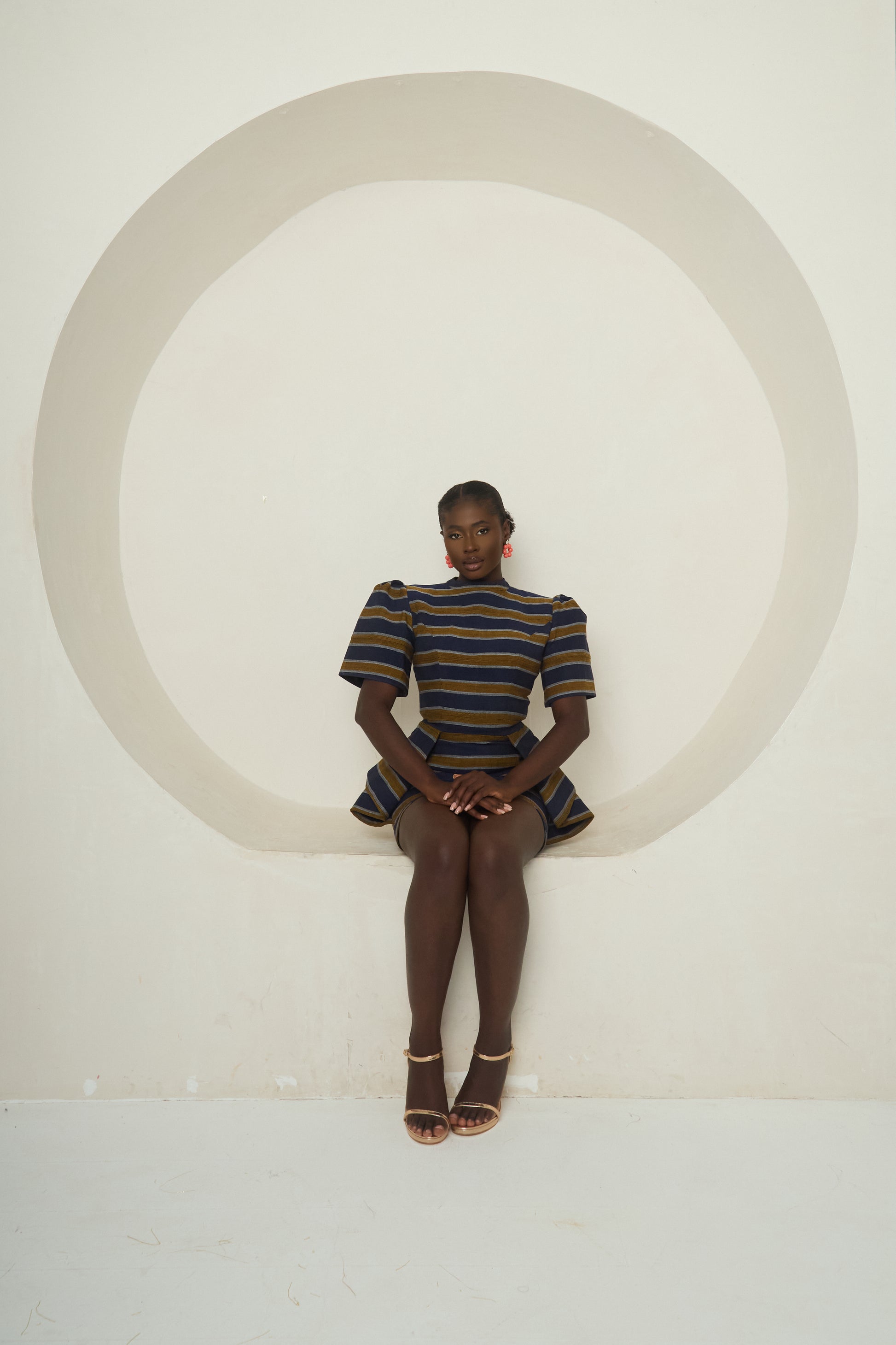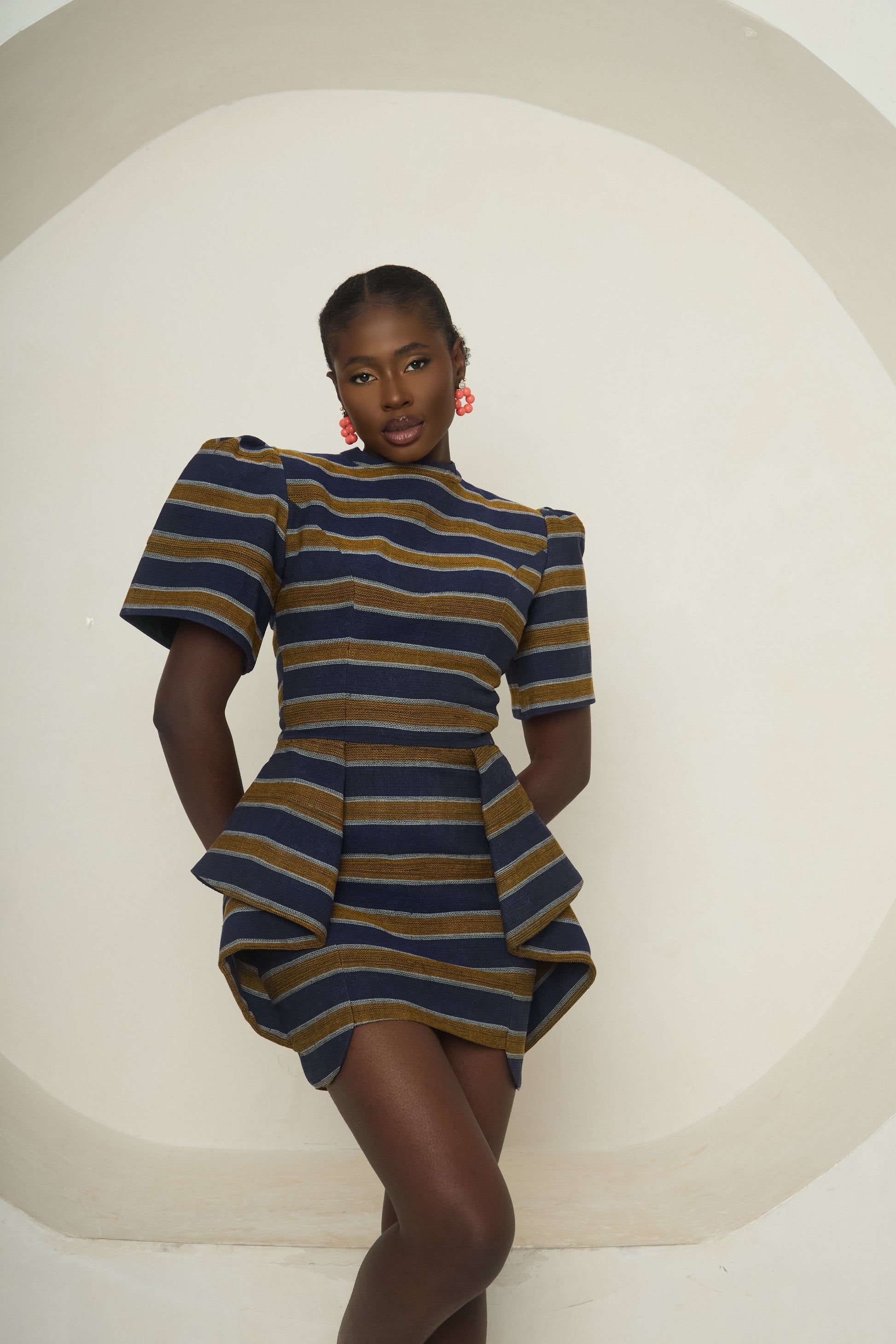 A youthful yet refined statement, the Èní Ìyì mini dress reimagines handwoven Aso-Oke in a fresh, versatile silhouette. With its cropped length and tailored short sleeves, it strikes a balance between structure and ease, transforming cultural pride into a modern fashion moment. Lightweight yet polished, it’s a timeless piece designed to move with confidence and grace.